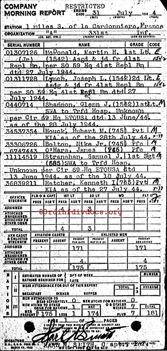 | Private Houck was a member of A Company. The morning report for July 18, 1944 on page 33 and 34 list him joining the unit from the 41st Replacement Battalion on July 17, 1944. Page 64, for July 31, 1944 lists him as killed in action on July 28, 1944. The relevant pages can be seen below. |
