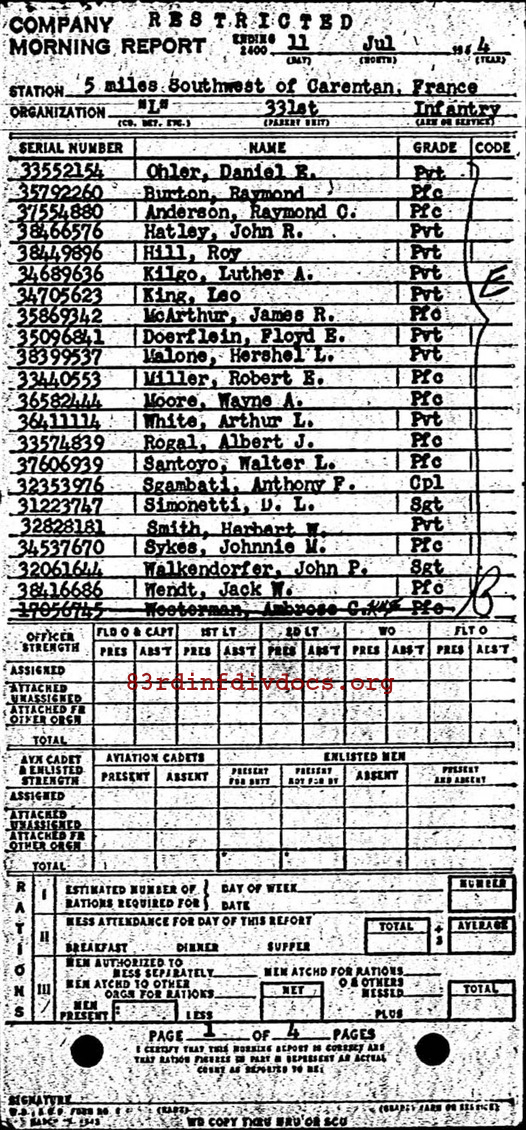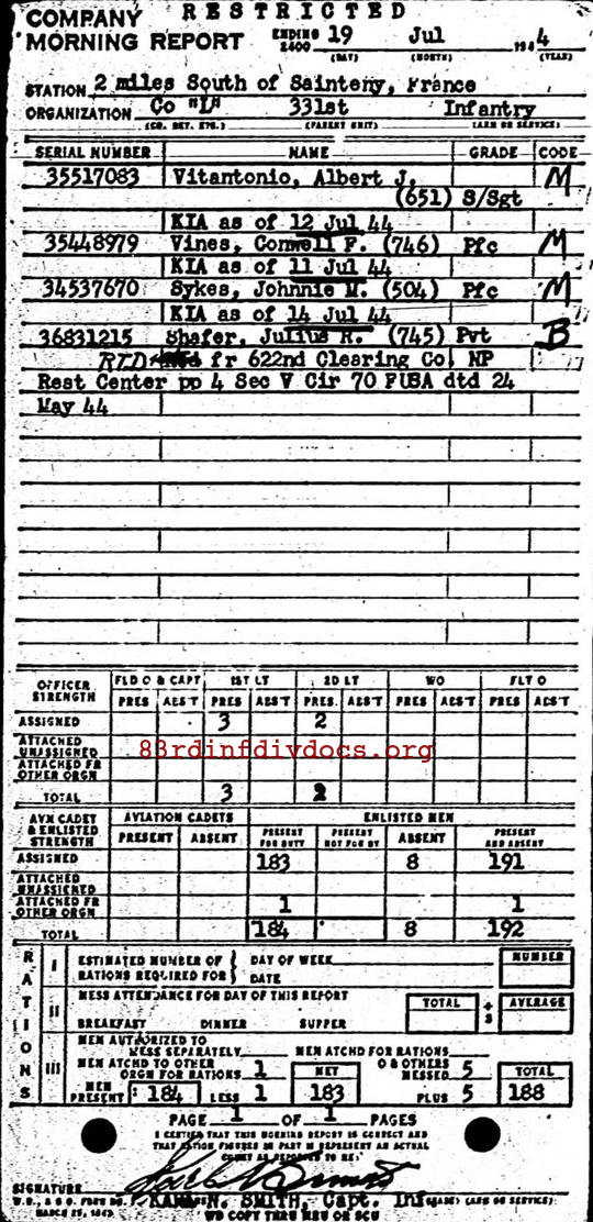 | Private First Class Sykes was a member of L Company. The morning report for July 11, 1944 on pages 13 and 14 show him joining L Company from the 48th Replacement Battalion. Page 30, for July 19, 1944, of the same morning report show his status changed to Killed in Action per July 14, 1944. The pages can be seen below. |