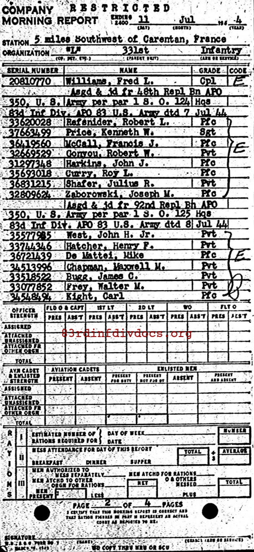 | 1944-07-11 | PFC | Assigned and joined from 48th Replacement Battalion as of July 11, 1944 | L / 331 | view page | |