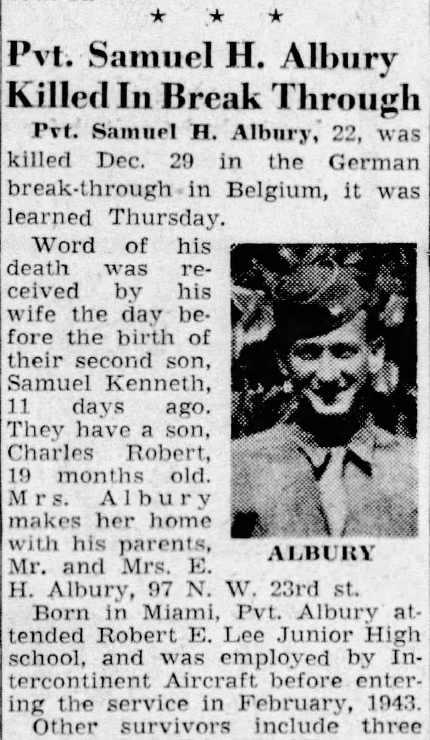 | Private Albury was a member of A Company. The morning report for Aug 1, 1944 on page 1 shows him joining A Company from the 41st Replacement Battalion. Page 1 can be seen here as well. Since we have no later documents we assume that Private Albury died while serving in A Company. |