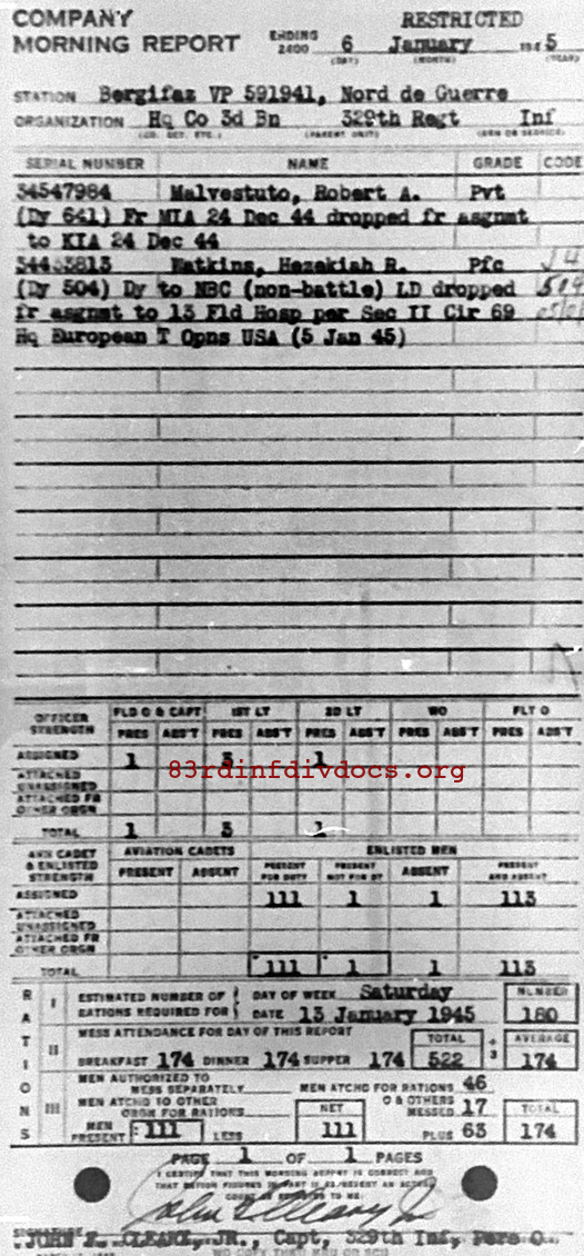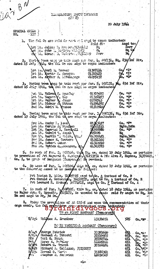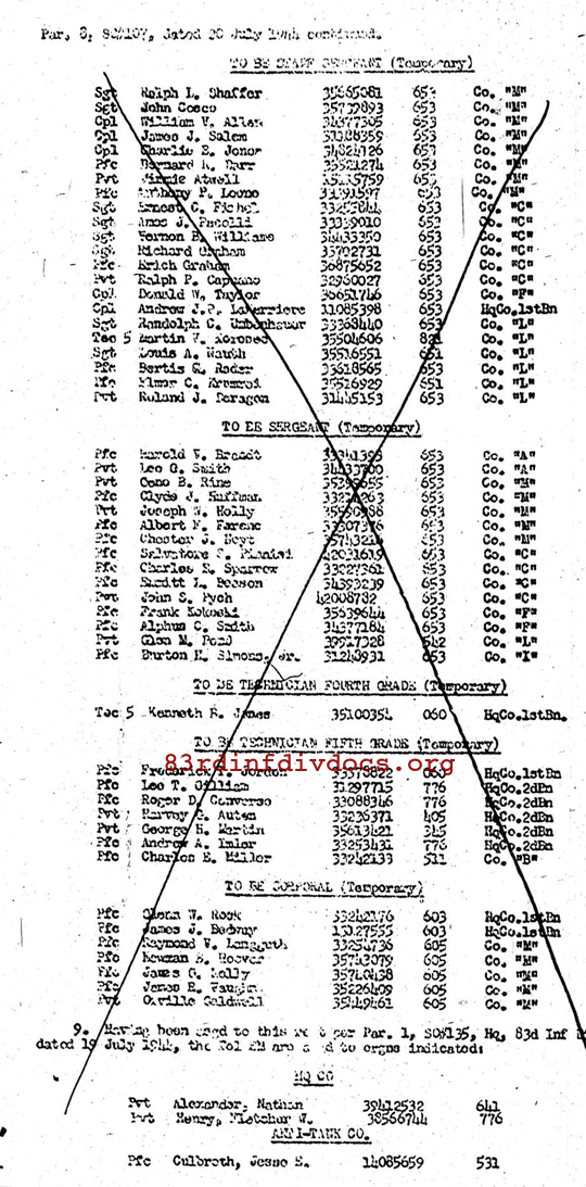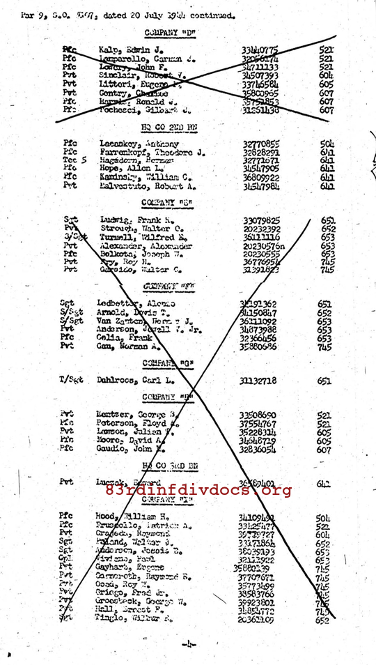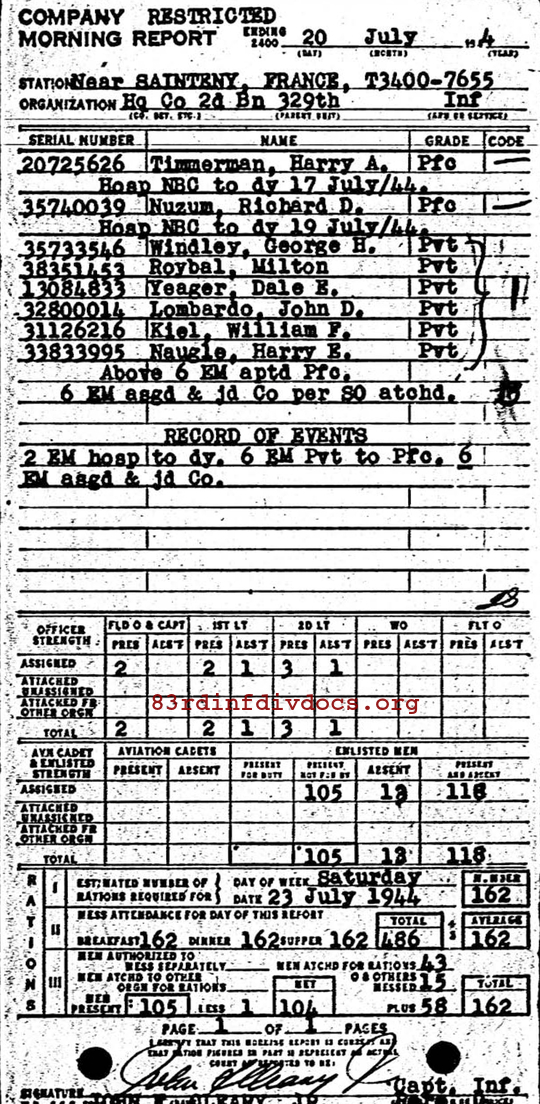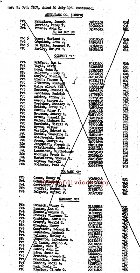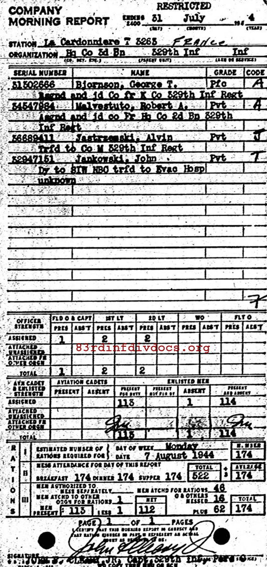 | 1944-07-31 | PVT | Assigned and joined from HQ Company, 2nd Battalion, 329th Infantry Regiment as of July 31, 1944 | HQCO3BN / 329 | view page | |