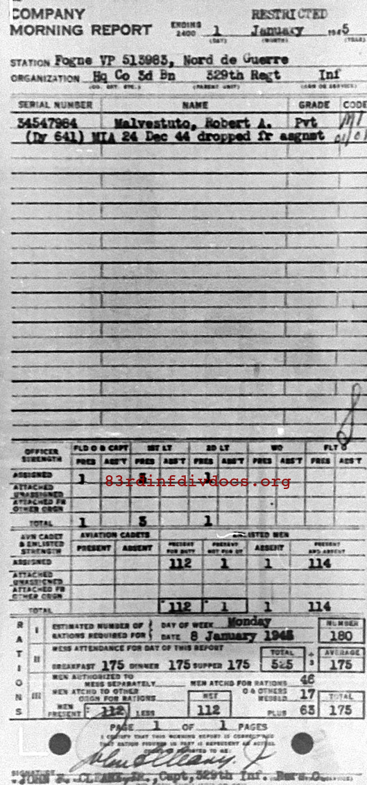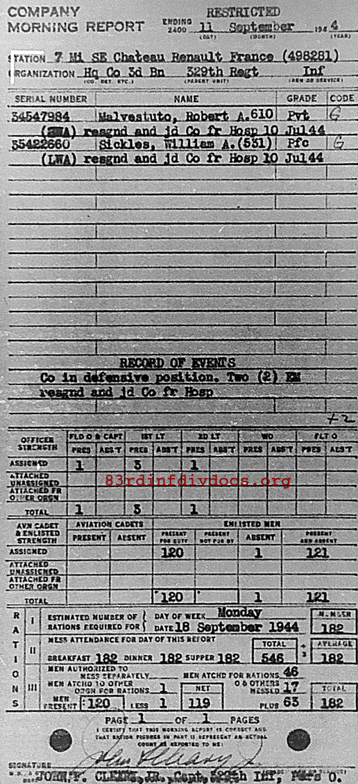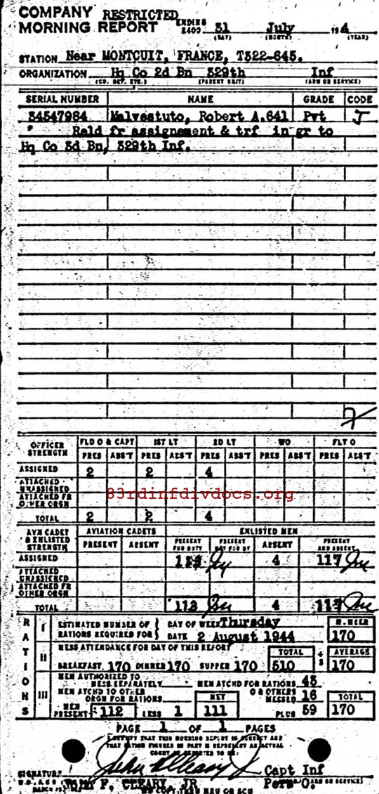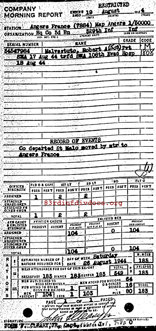 | Private Malvestuto was a member of the Headquarters Company, 3rd Battalion. The morning report of Headquarters Company 2nd Battalion for July 31, 1944 on page 55 lists him transferred to HQ Company 3rd Battalion. The morning report of Headquarters Company 3rd Battalion for July 31, 1944 on page 38 lists him joining the unit. The morning report for August 19, 1944 on page 19 lists him severely wounded in action and transferred to the 108th Evacuation Hospital. All relevant pages can be seen below. Since we have no later documents we assume that Private Malvestuto died while serving in Headquarters Company, 3rd Battalion. |