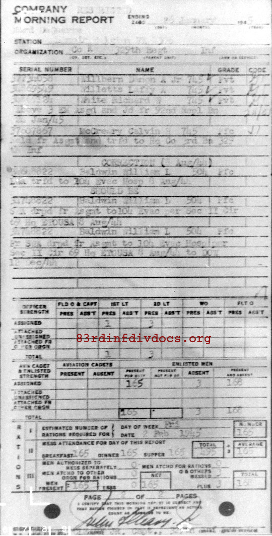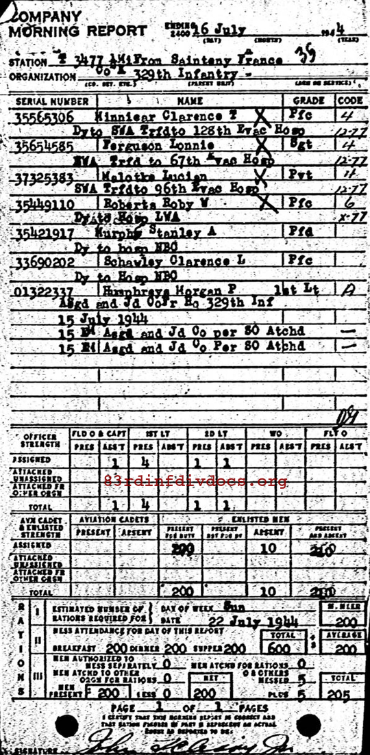| rivate First Class Baldwin was a member of K Company. The morning report for July 19, 1944 on page 55 lists his promotion from Private to Private First Class. The morning report for August 8, 1944 on page 17 lists him severely wounded in action and transferred to the 104th Evacuation Hospital. All relevant pages can be seen below. Since we have no later documents we assume that Private First Class Baldwin died while serving in K Company. |