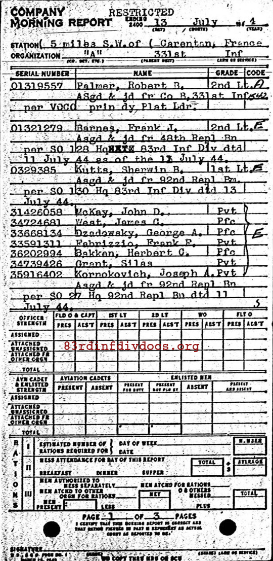 | Private First Class West was a member of A Company. The morning report for July 13, 1944 on page 22 lists him joining the unit from the 92nd Replacement Battalion. Page 53 and 54, for July 25, 1944 list him as missing in action on July 20, 1944. The pages can be seen below. |