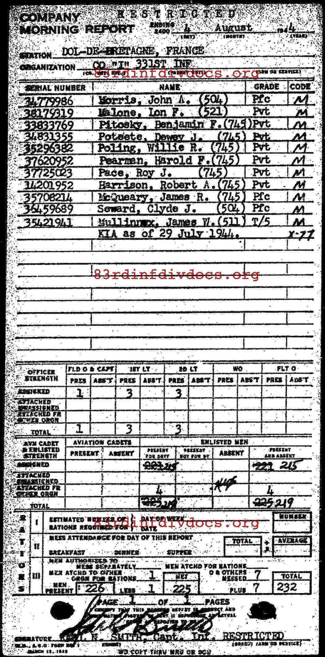| 1944-08-04 | PVT | Killed in action on July 29, 1944 | 745 | I / 331 | view page |