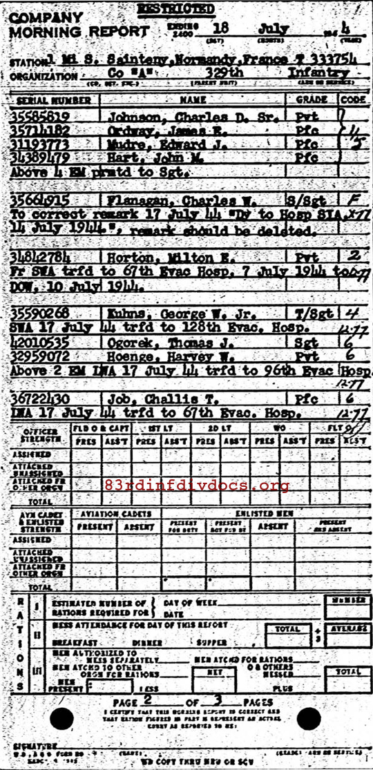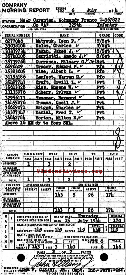 | 1944-07-18 | PVT | Died of wounds on July 10, 1944 | A / 329 | view page | |