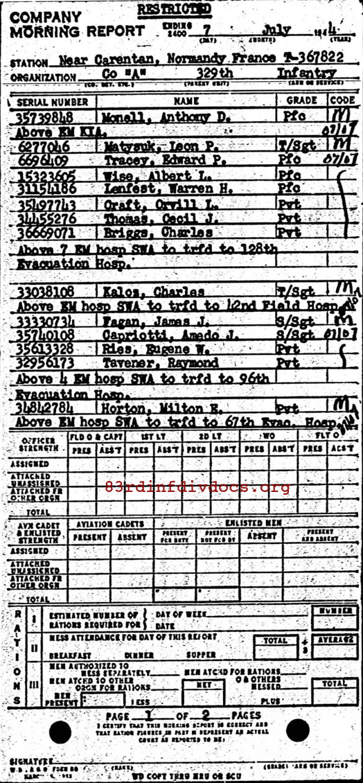 | 1944-07-07 | PVT | Severely wounded in action and transferred to 67th Evacuation Hospital on July 6, 1944 | A / 329 | view page | |
