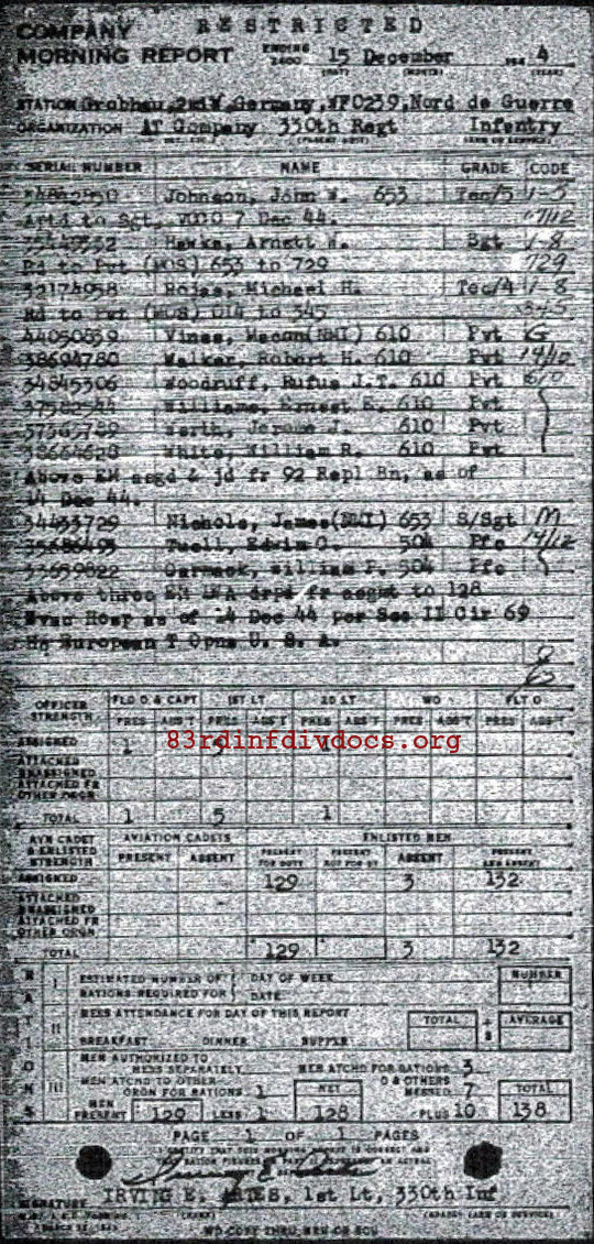 | Private First Class Woodruff was a member of the Anti Tank Company. The morning report for December 15, 1944 on page 15 lists him joining the unit from the 92nd Replacement Battalion on December 14, 1944. The page can be seen below. |