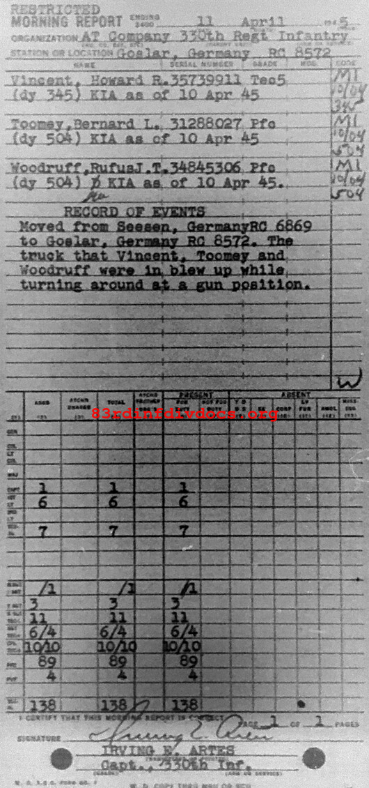 | Unit | Anti-tank Company, 330th Infantry Regiment, 83rd Infantry Division |