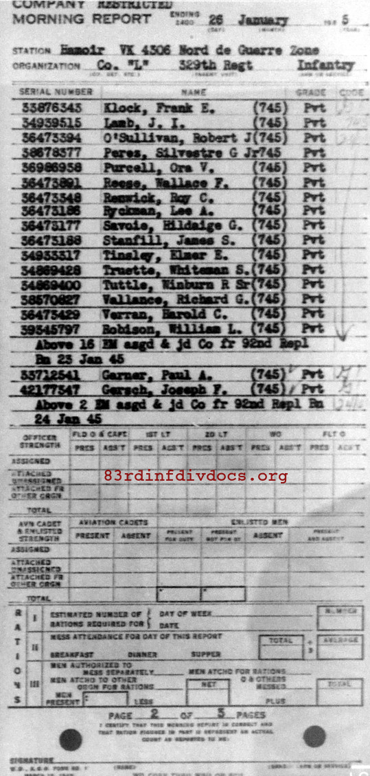 | 1945-01-26 | PVT | Assigned and joined from 92nd Replacement Battalion as of January 23, 1945 | 745 | L / 329 | view page |