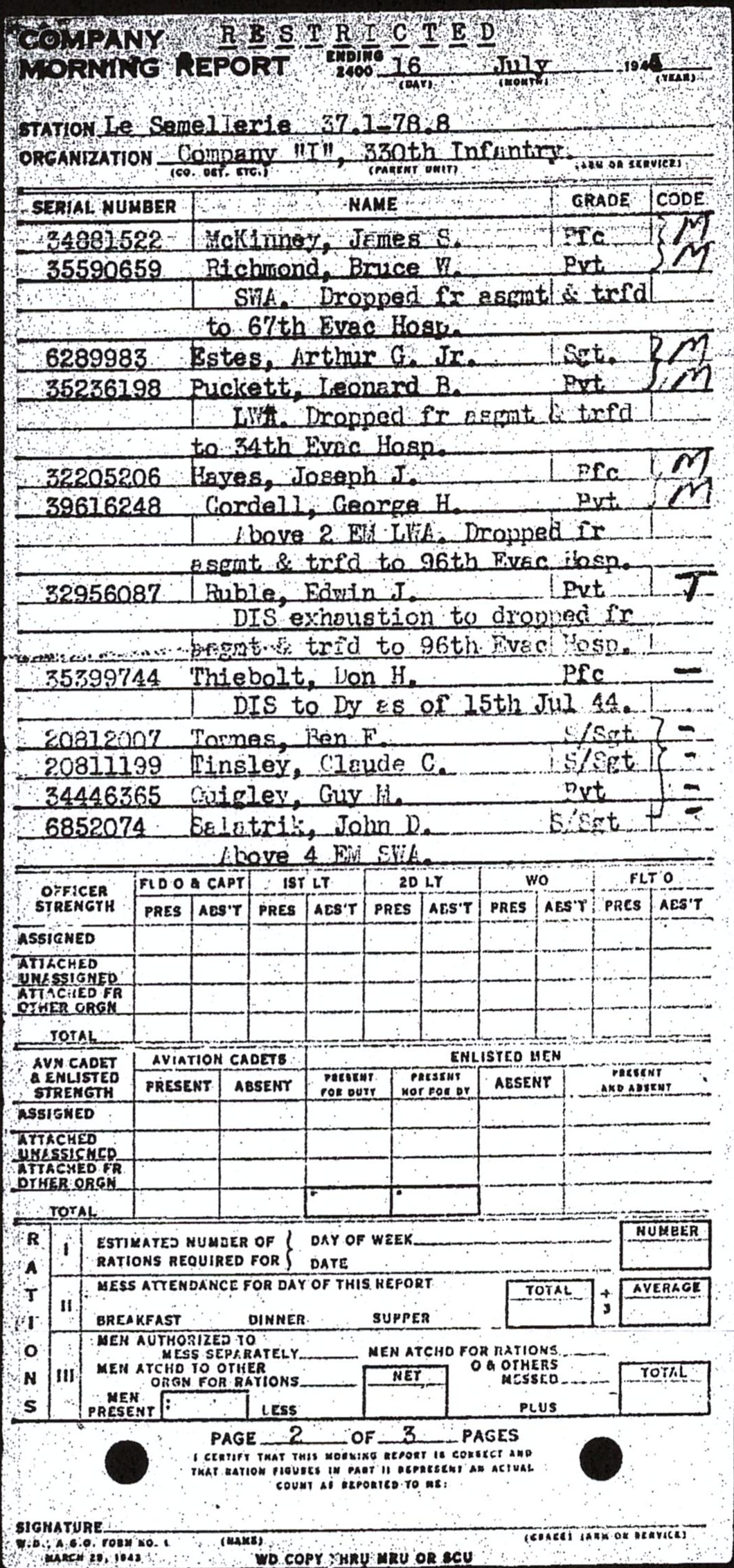 | 1944-07-16 | PFC | Severely wounded in action and transferred to 67th Evacuation Hospital on July 16, 1944 | I / 330 | view page | |