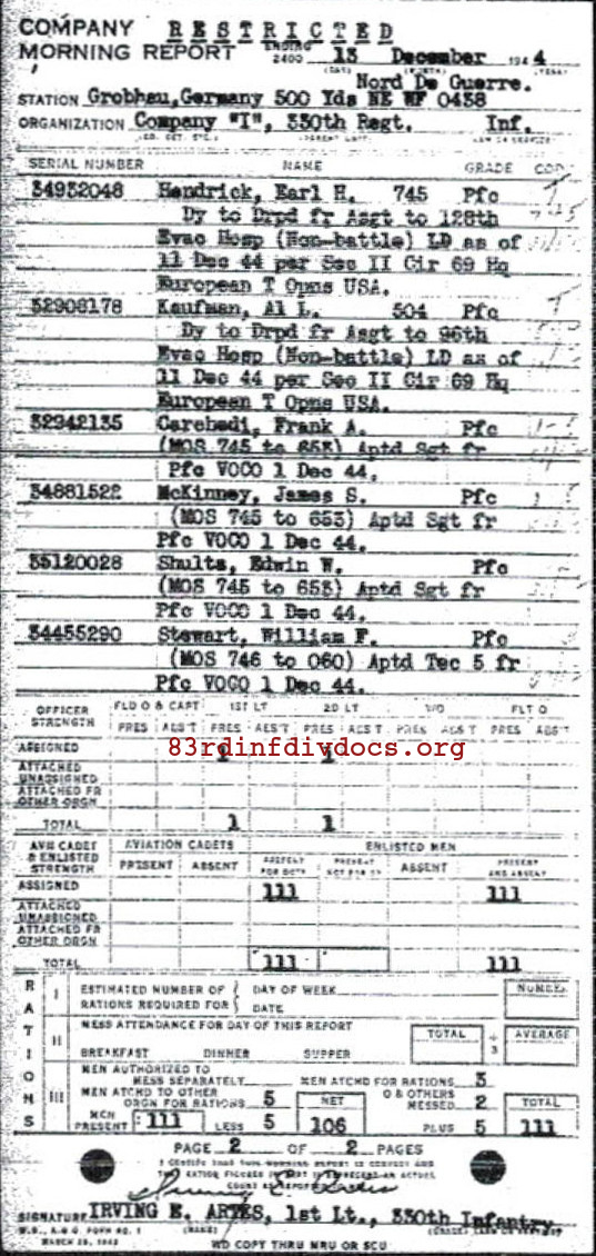 | Sergeant McKinney was a member of I Company. The morning report for July 16, 1944 on page 26 lists him severely wounded in action and transferred to the 67th Evacuation Hospital on the same date. The morning report for August 27, 1944 on page 32 lists him rejoining the unit on the same date. The morning report for December 13, 1944 on page 28 lists his promotion to Sergeant on December 1, 1944. Page 39, for December 20, 1944, lists him as missing in action as of December 16, 1944. The pages can be seen below. |
