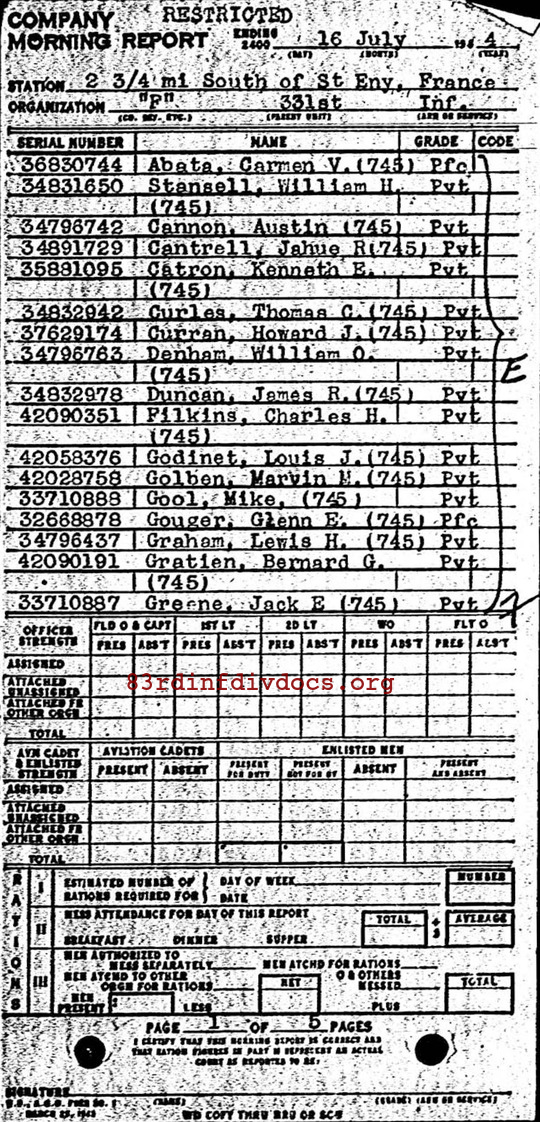 | 1944-07-16 | PVT | Assigned and joined from 86th Replacement Battalion as of July 16, 1944 | 745 | F / 331 | view page |