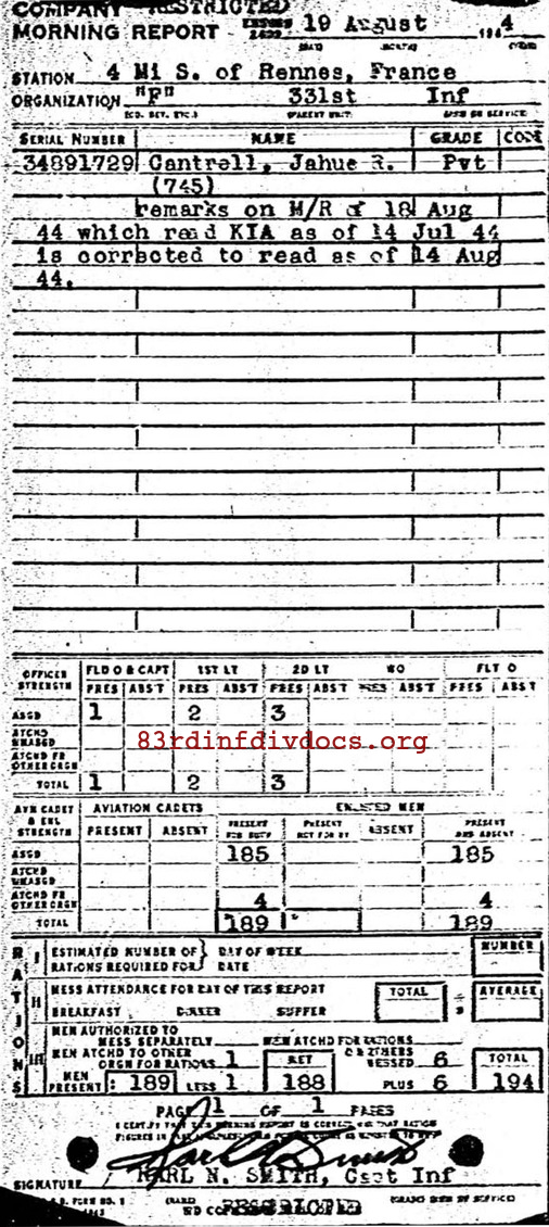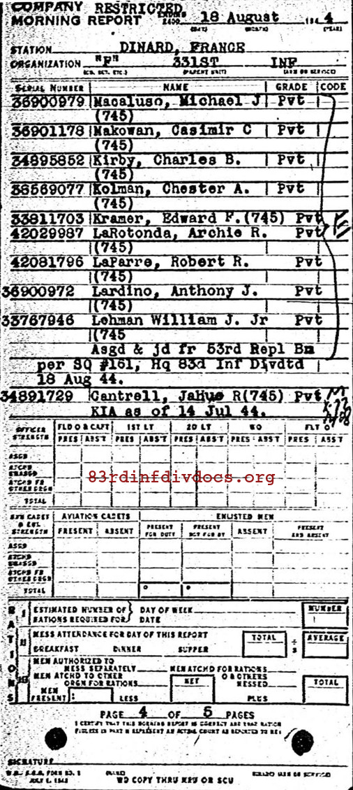| 1944-08-19 | PVT | Killed in action on August 14, 1944, which corrects MR of August 18, 1944 | F / 331 | view page | |