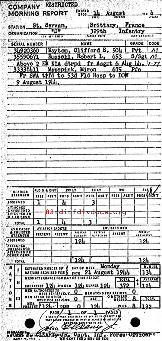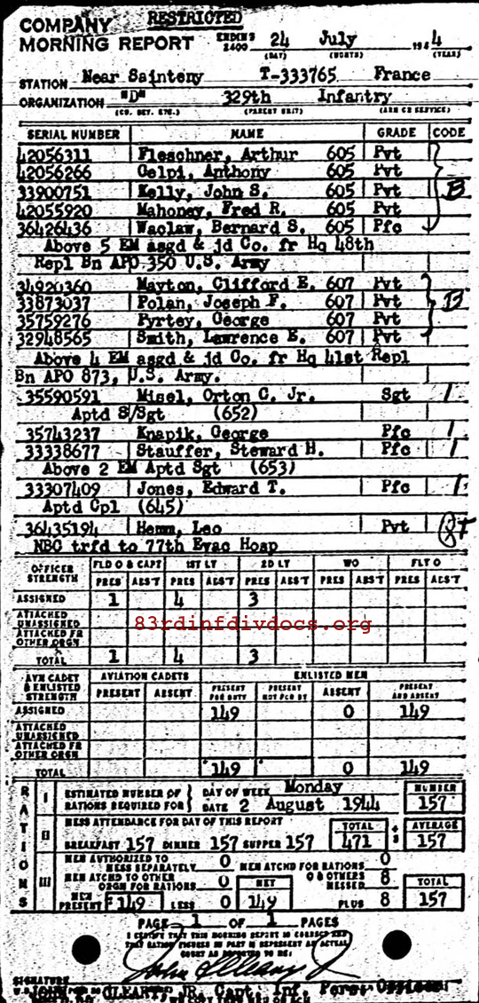 | Private Mayton was a member of D Company. The morning report for July 24, 1944 on page 37 lists him joining D Company from HQ 41st Replacement Battalion as MOS 607 Light Mortar Crewman. Page 37 can be seen here as well.