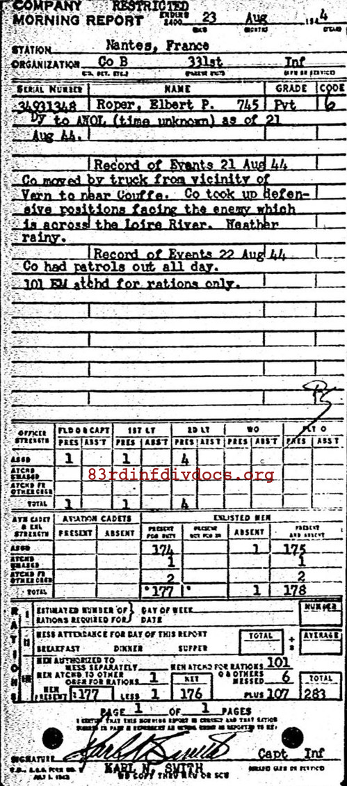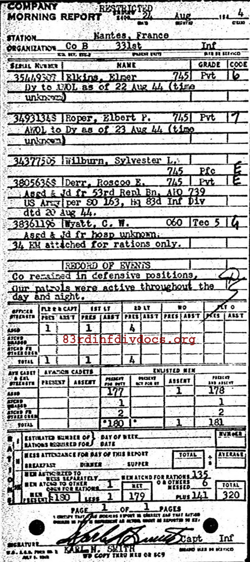 | 1944-08-23 | PVT | Absent without offical leave as of August 21, 1944 | 745 | B / 331 | view page |