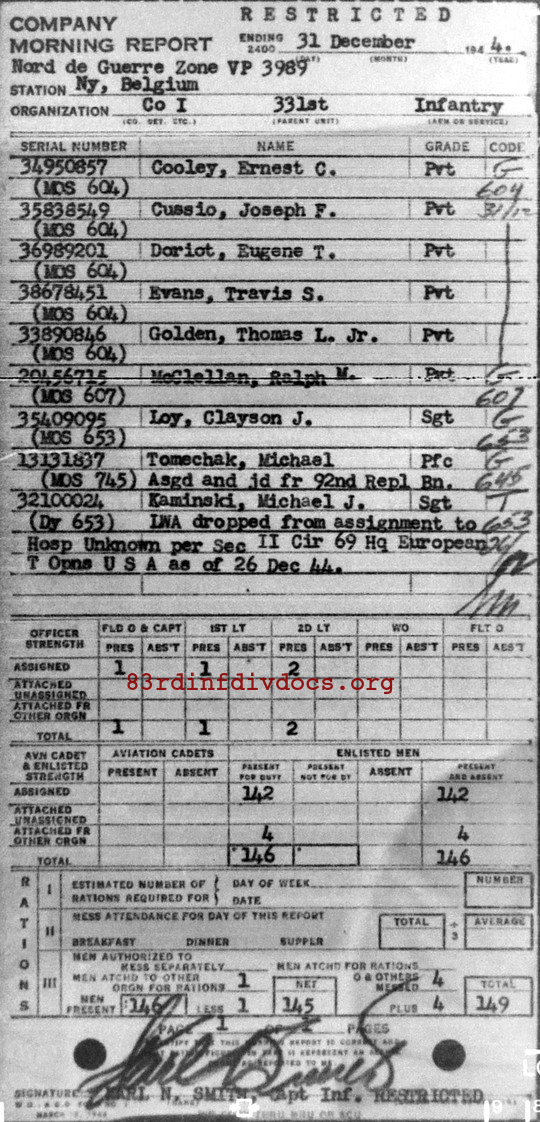 | 1944-12-31 | PVT | Assigned and joined from 92nd Replacement Battalion as of December 31, 1944 | 604 | I / 331 | view page |