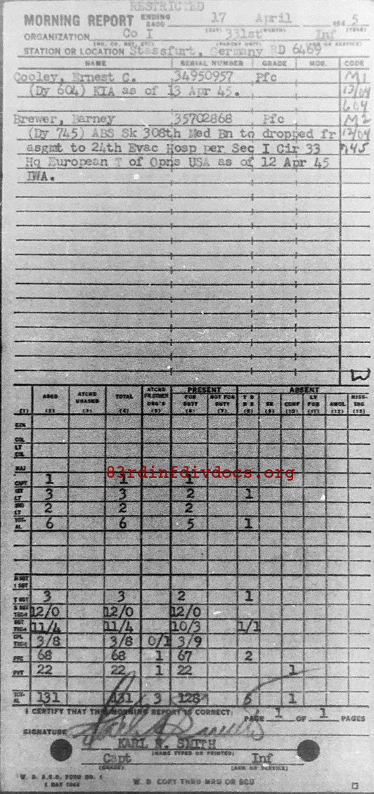 | 1945-04-17 | PFC | Killed in action on April 13, 1945 | 604 | I / 331 | view page |