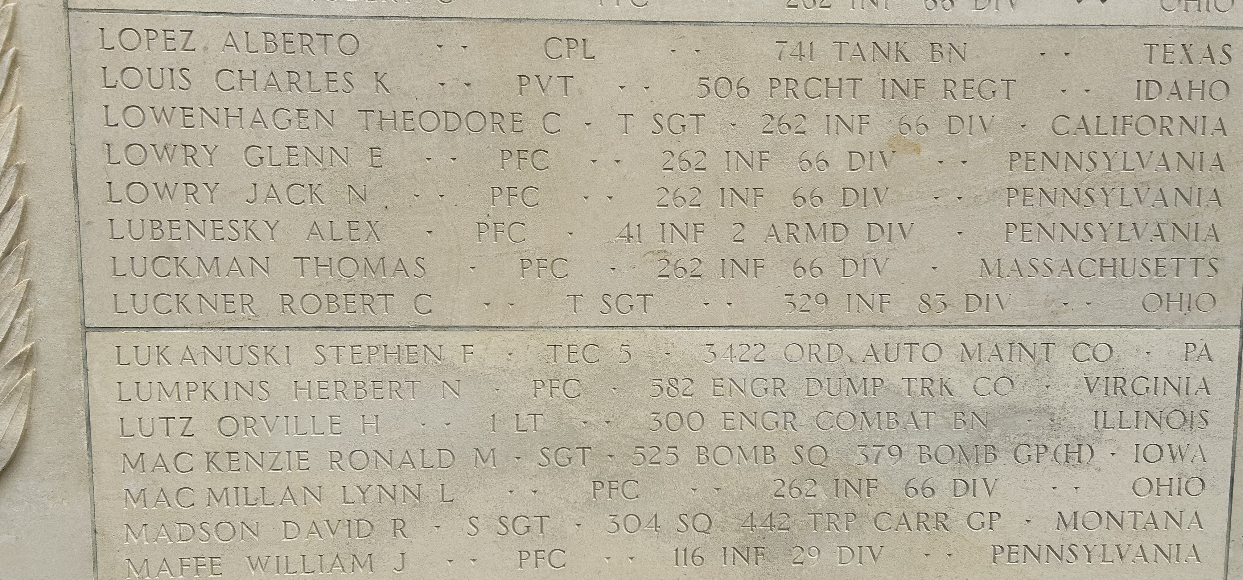 | 1944-07-13 | TSGT | Killed in action on July 11, 1944 | I / 329 | view page | |