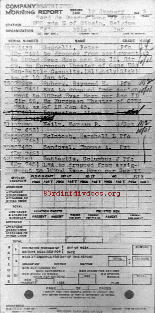 | 1945-01-12 | PFC | Severely wounded in action and transferred to 102nd Evacuation Hospital on January 10, 1945 | 745 | F / 331 | view page |