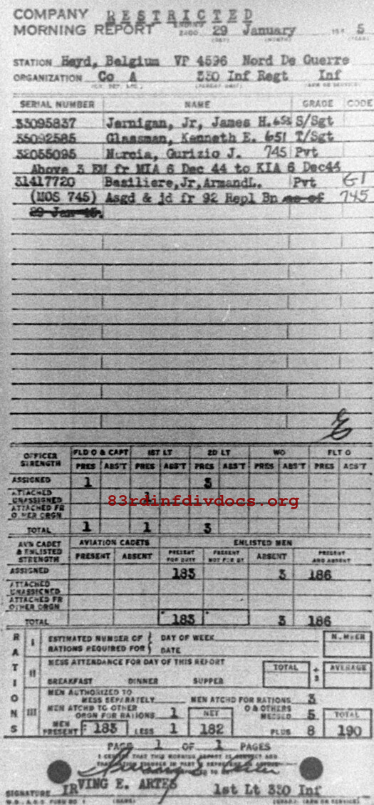 | Technical Sergeant Glassman was a member of A Company. The morning report for July 10, 1944 on page 15 list him joining the unit from the 92nd Replacement Battalion on July 8, 1944.