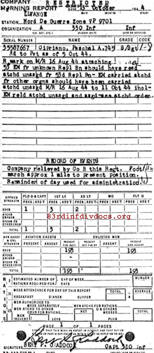 | Unit | A Company, 330th Infantry Regiment, 83rd Infantry Division |