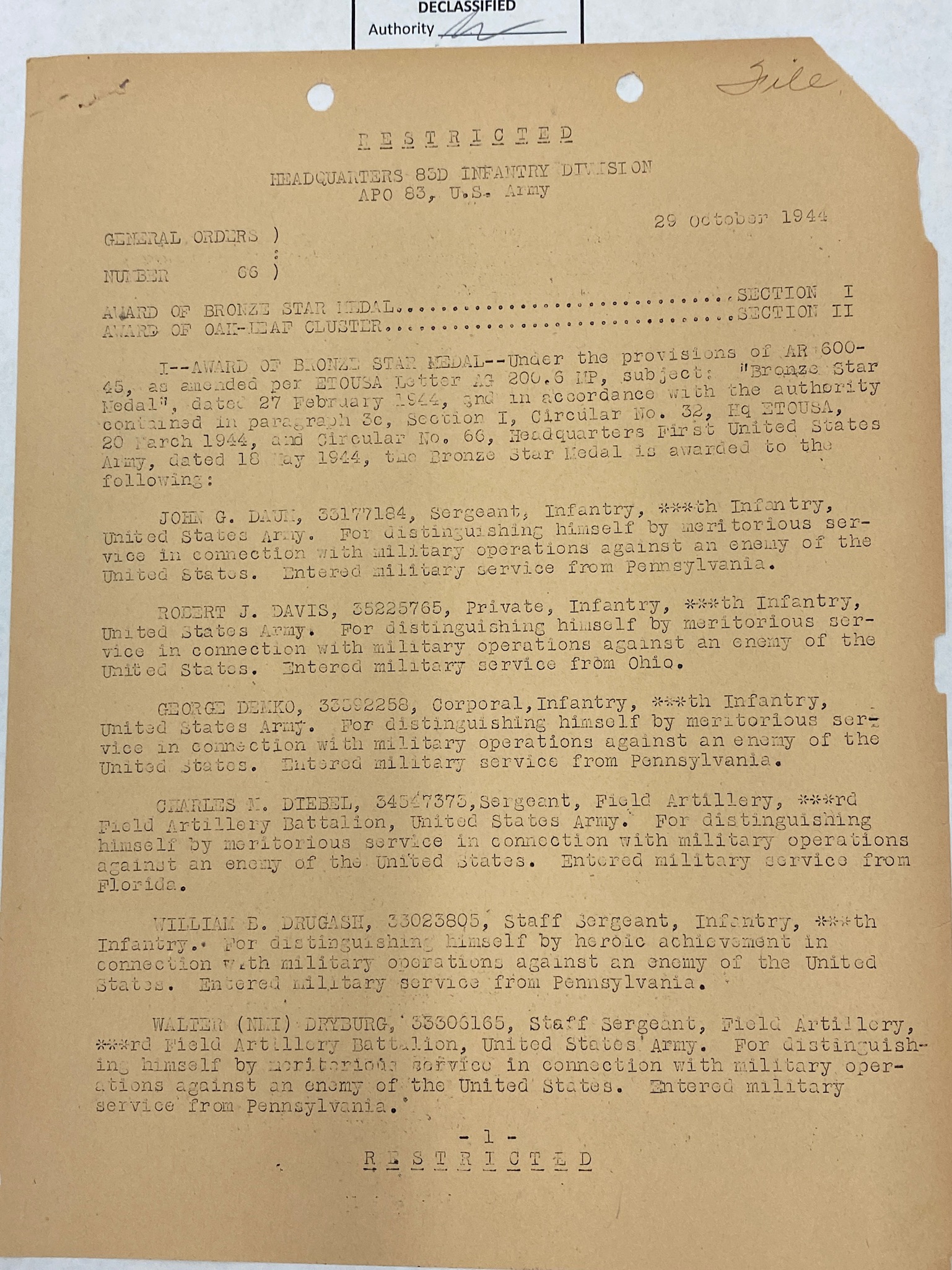 | Listed in 330th Infantry Regiment Casualties and Awards: Bronze Star Medal for Meritorious Service in General Order 66 as a Private in HQ3BN/330 | 84 | ||||
