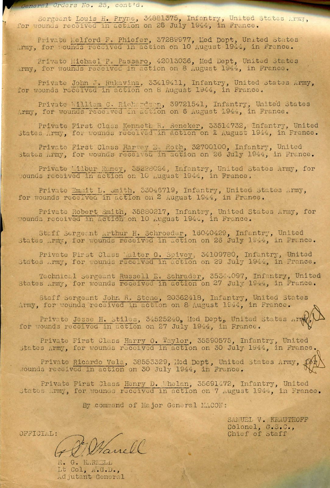 The morning report for August 28, 1944 on page 43 lists him as Lightly Injured in Action and transferred to the 108th Evacuation Hospital on August 15, 1944. The morning report for October 22, 1944 on page 25 lists his promotion to Private First Class on October 20, 1944. The pages can be seen below. General Order 25 lists his commendation for a Purple Heart for wounds received in action on August 10, 1944. |