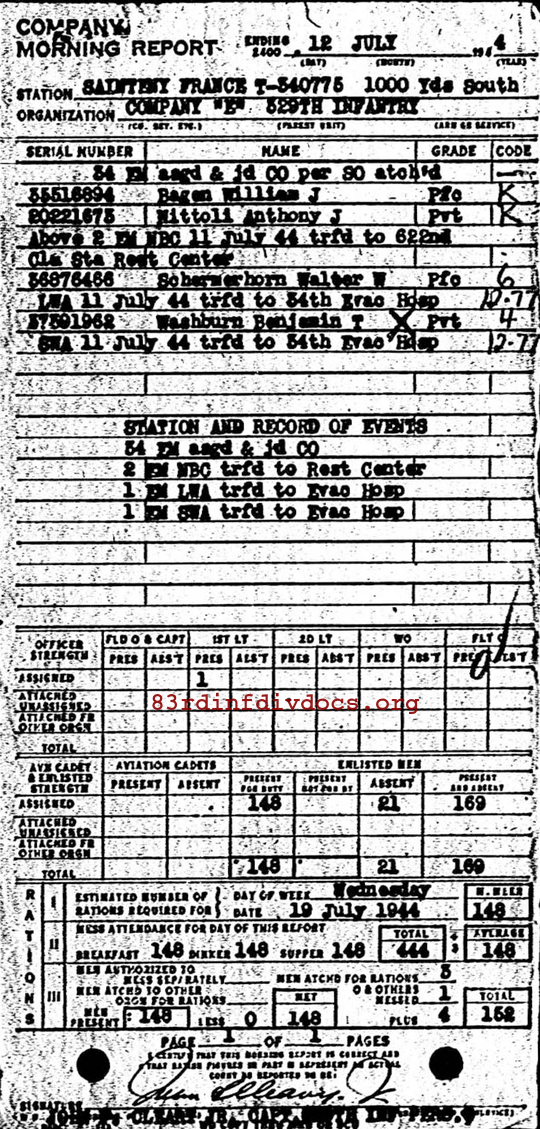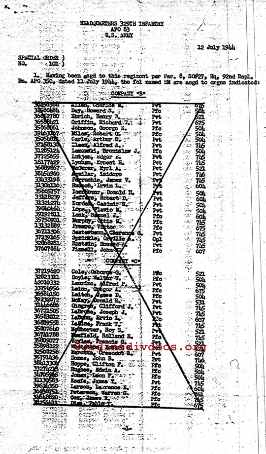 | 1944-07-12 | PFC | Assigned and joined from 92nd Replacement Battalion as of July 12, 1944 | 745 | E / 329 | view page |