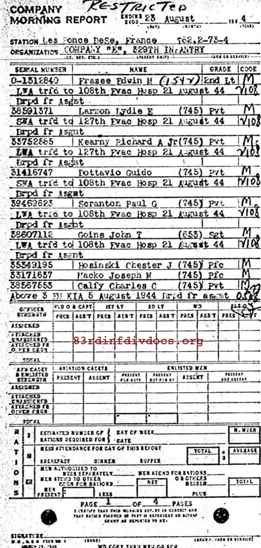 | Private First Class Hosinski was a member of E Company. The morning report for August 23, 1944 on page 42 lists him as killed in action on August 5, 1944. The page of this morning report can be seen below. |