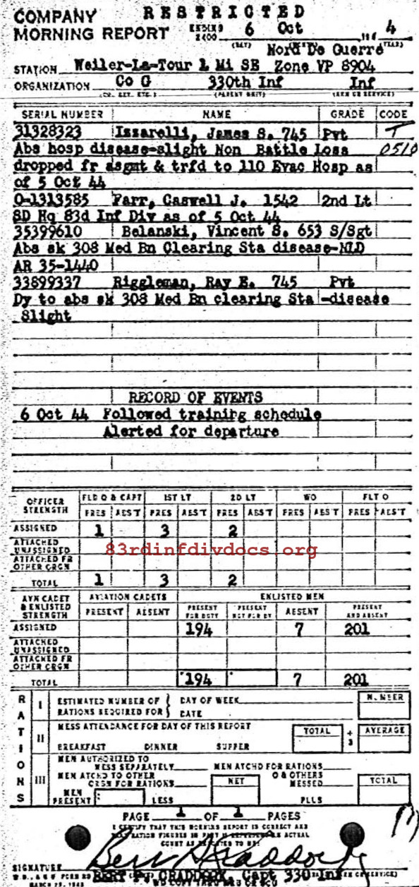 | 1944-10-09 | SSGT | Returned to duty from Clearing Station, 308th Medical Battalion on October 8, 1944 | 653 | G / 330 | view page |