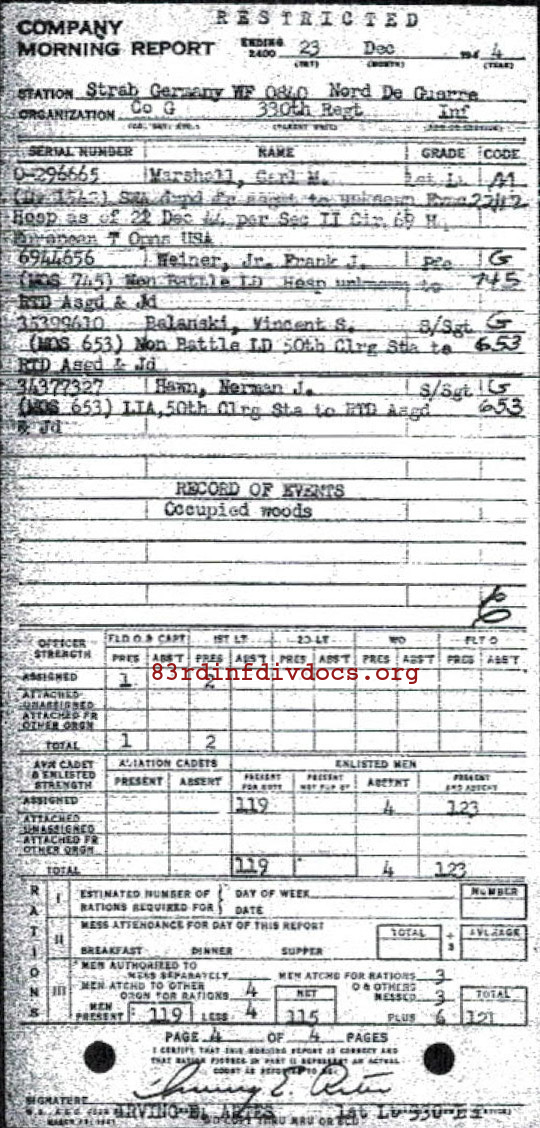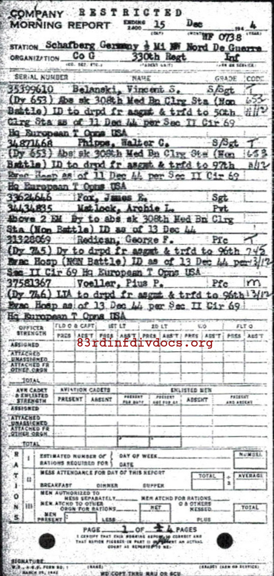 | 1944-12-13 | SSGT | Non battle casualty and duty to Clearing Station, 308th Medical Battalion on December 11, 1944 | G / 330 | view page | |