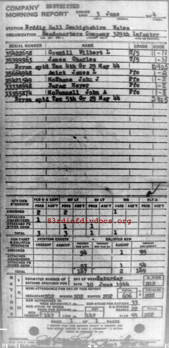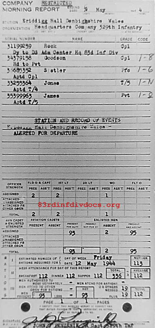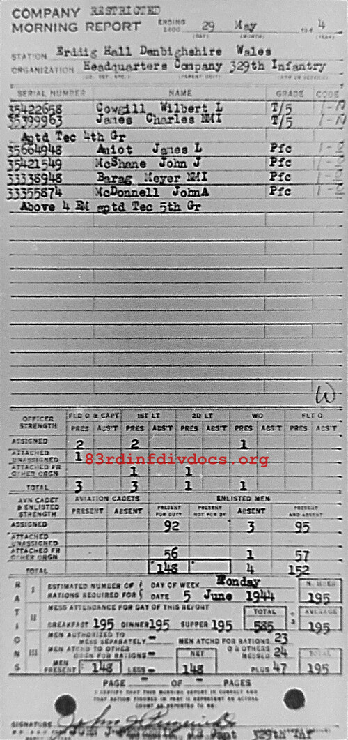 | Unit | HQ Company, 329th Infantry Regiment, 83rd Infantry Division |