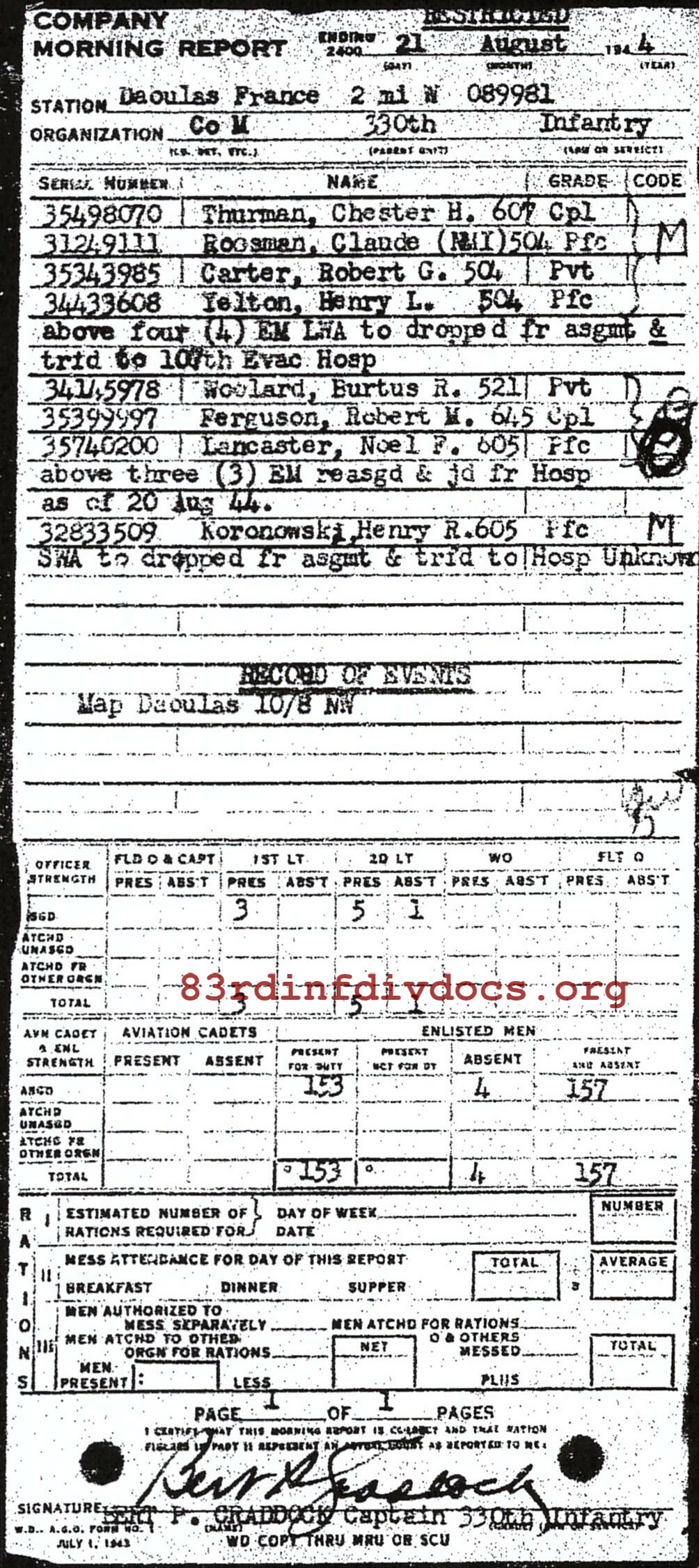 | 1944-07-04 | CPL | Severely wounded in action and transferred to 128th Evacuation Hospital on July 4, 1944 | M / 330 | view page | |