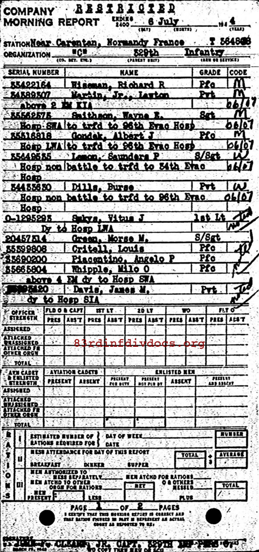 | Private First Class Wiseman was a member of C Company. The morning report for July 6, 1944 on page 6 shows him killed in action. Page 6 can be seen here. |