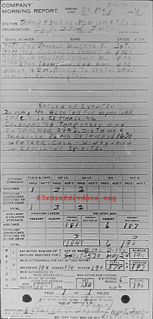 | 1944-05-20 | PFC | Attached to 104th Ordnance Medium Maintenance Company as of May 20, 1944 for rations and quarters | K / 331 | view page | |