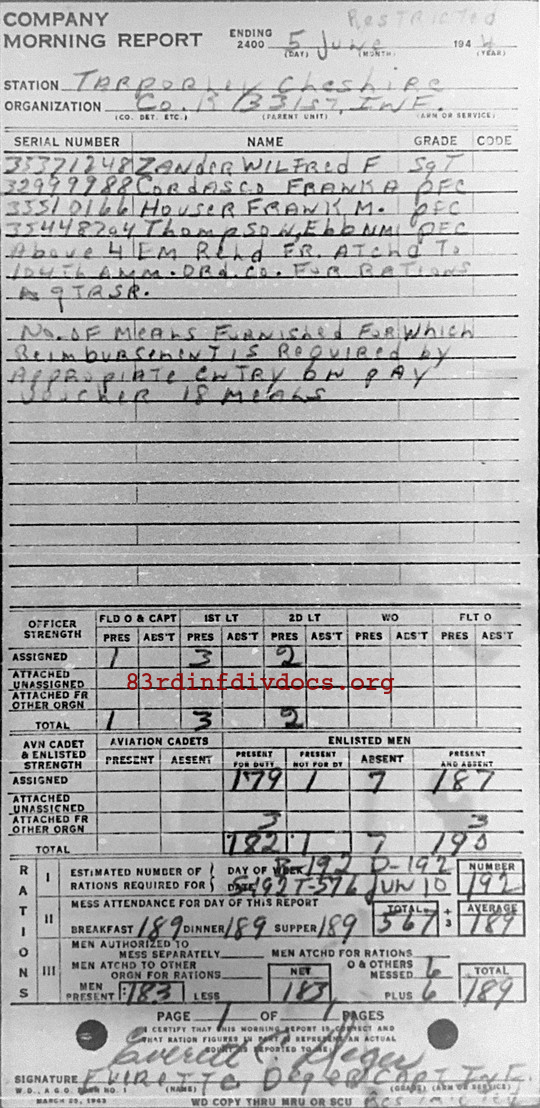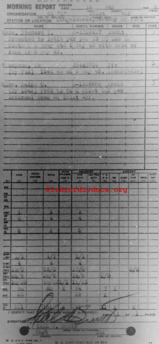 | 1944-06-05 | PFC | Returned to duty from 104th Ordnance Medium Maintenance Company on June 5, 1944 | K / 331 | view page | |