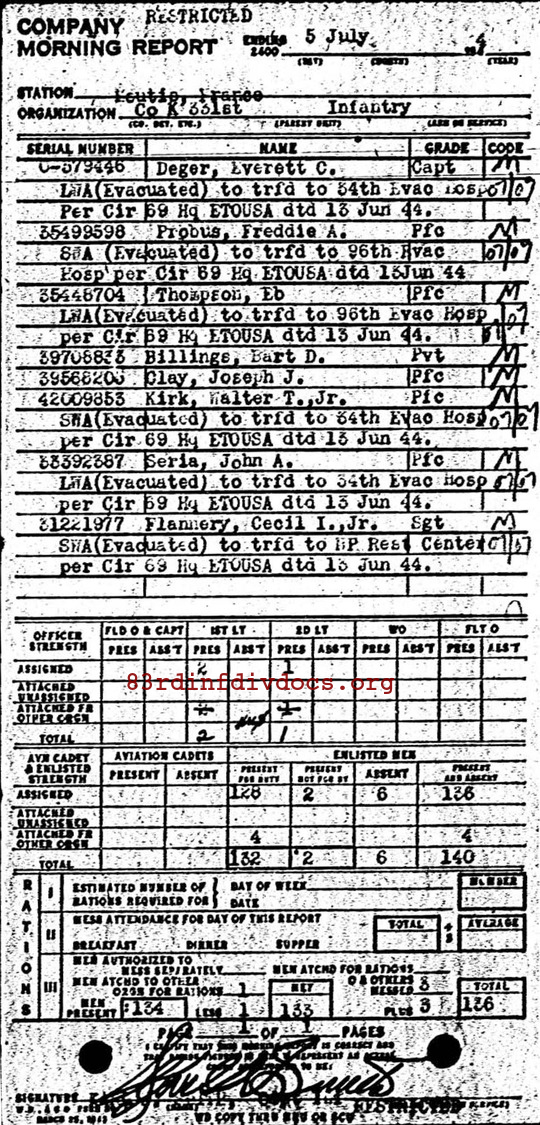| 1944-07-05 | PFC | Lightly wounded in action and transferred to 96th Evacuation Hospital on July 5, 1944 | K / 331 | view page | |