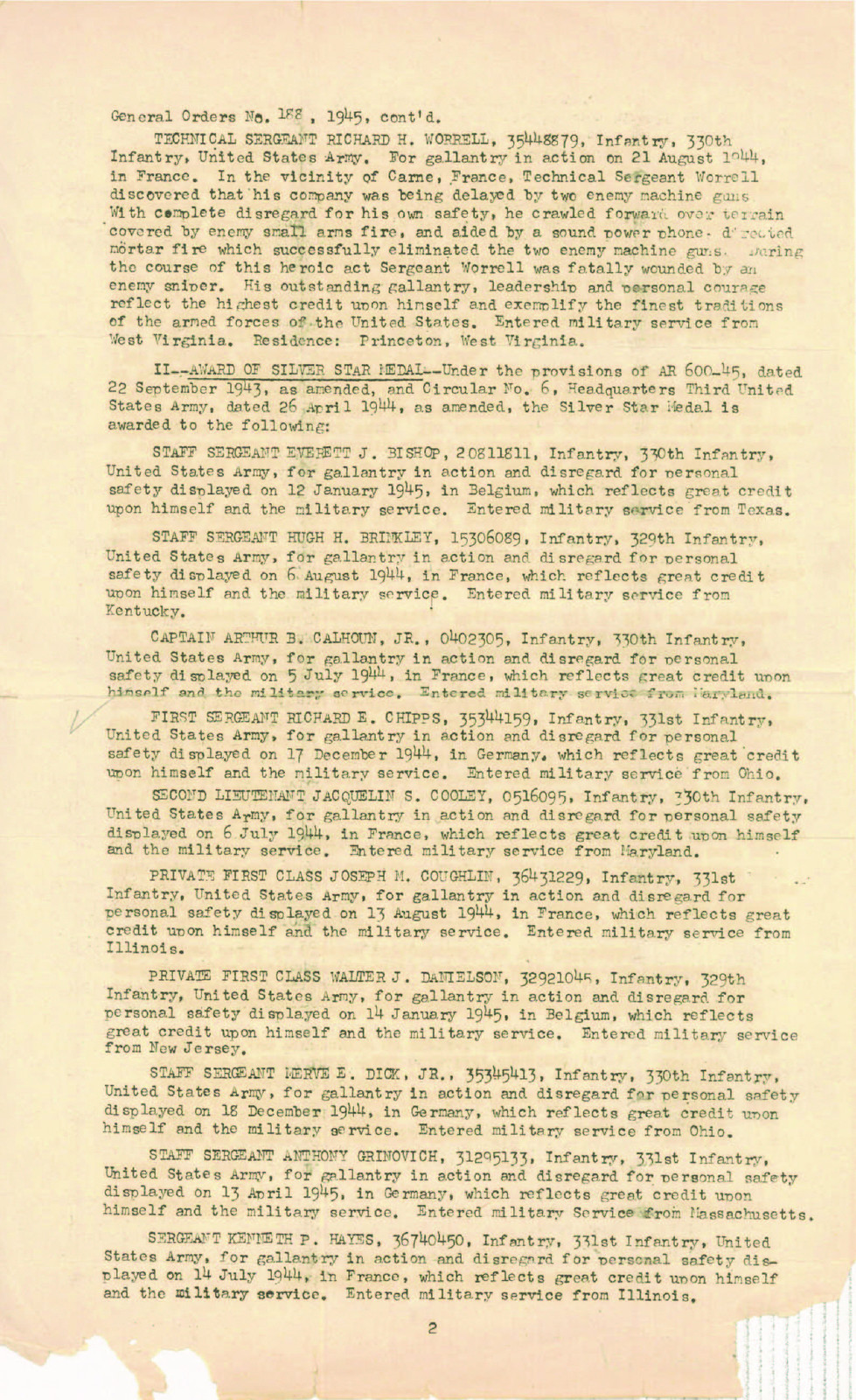 Technical Sergeant Richard H Worrell was awarded a Silver Star posthumously. The commendation is listed in General Order 188 which can be seen here and writes: TECHNICAL SERGEANT RICHARD H. WORRELL, 35448879, Infantry, 330th Infantry, United States Army. For gallantry in action on 21 August 1944, in France. In the vicinity of Carne, France, Technical Sergeant Worrell discovered that his company was being delayed by two enemy machine guns. With complete disregard for his own safety, he crawled forward over terrain covered by enemy small arms fire, and aided by a sound power phone directed mortar fire which successfully eliminated the two enemy machine guns. During the course of this heroic act Sergeant Worrell was fatally wounded by an enemy sniper. His outstanding gallantry, leadership and personal courage reflect the highest credit upon himself and exemplify the finest traditions of the armed forces of the United States. Entered military service from West Virginia. Residence: Princeton, West Virginia. |