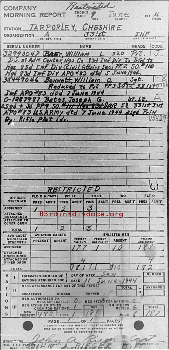 | Private Bennet was a member of A Company. The morning report for June 9, 1944, shows Sgt Bennet demoted to Private per June 7, 1944 while the unit was still in Tarporley, Chesire, UK. The morning report for August 1, 1944 on page 4 lists him as missing in action as of the 20th of July 1944. The pages can be seen below. |