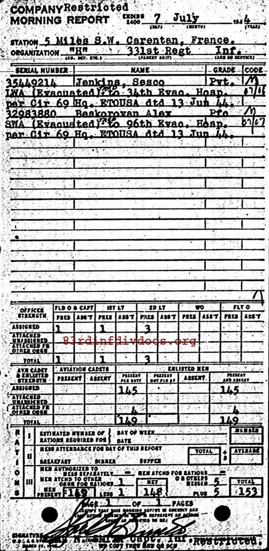| 1944-07-07 | PVT | Lightly wounded in action and transferred to 34th Evacuation Hospital on July 7, 1944 | H / 331 | view page | |