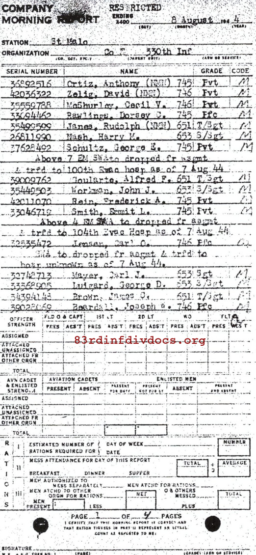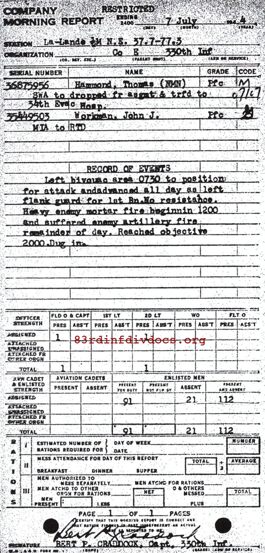 | 1944-07-07 | PFC | Returned to duty from missing in action on July 7, 1944 | E / 330 | view page | |