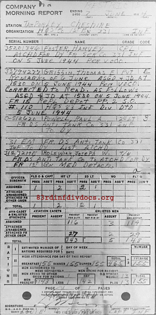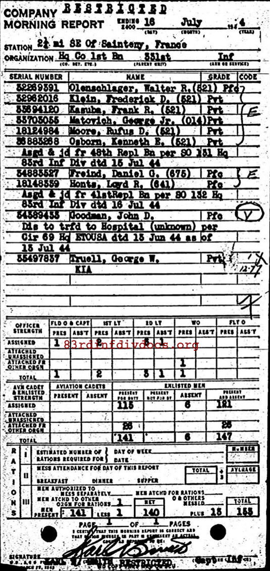 | The 331st Casualty Report (page 4, #154) for 1944 lists Pvt. Truell as member of H-1 Co. The morning reports list Pvt Truell as member of the Anti-Tank Platoon, HQ Company, 1st Battalion, 331st Infantry Regiment. The pages can be seen below. |