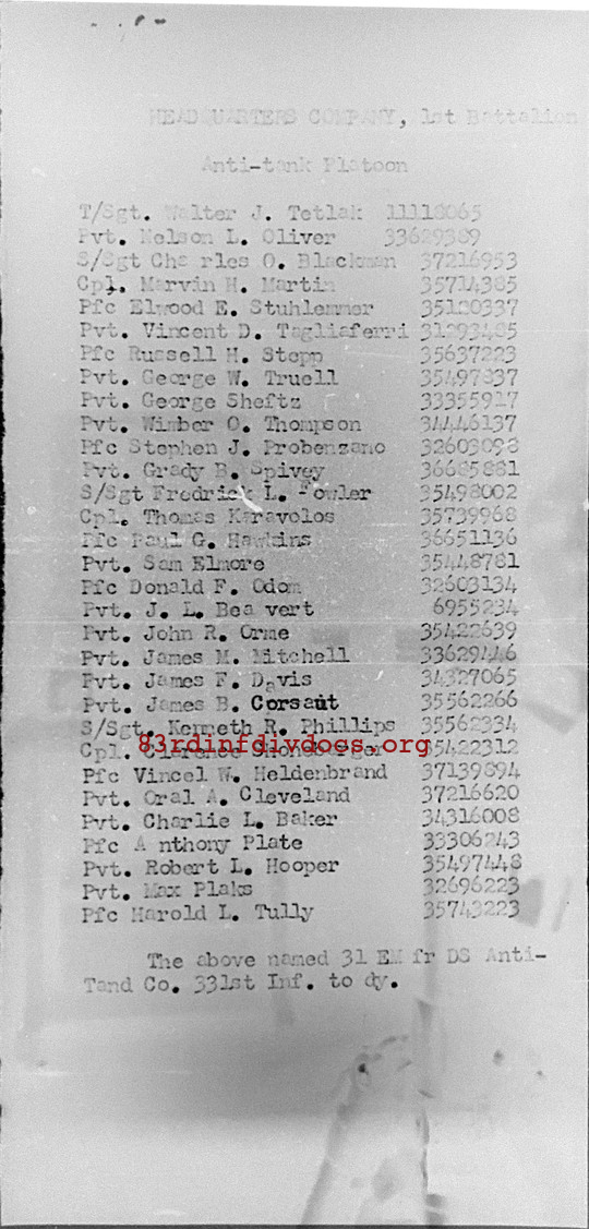 | Unit | AT Platoon, Headquarters Company, 1st Battalion, 331st Infantry Regiment, 83rd Infantry Division |