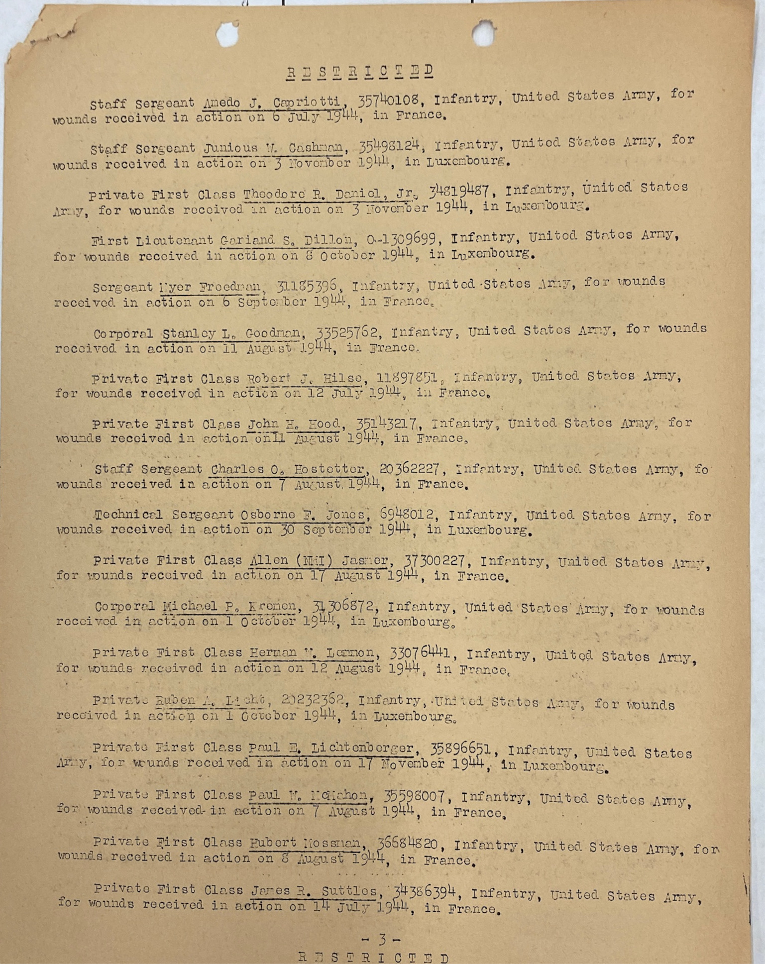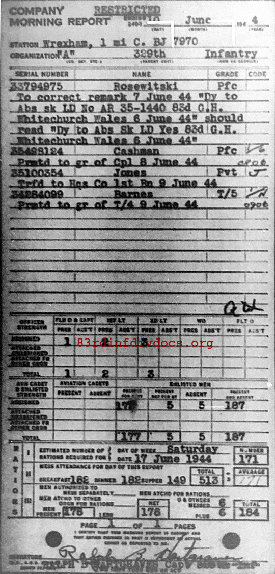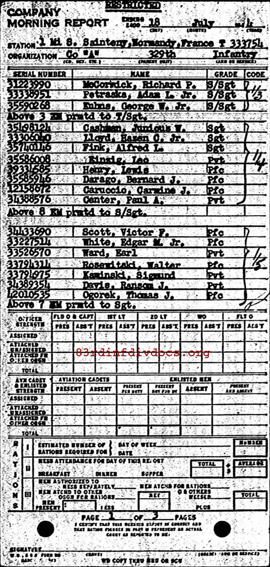 | Staff Sergeant Cashman was a member of A Company. The morning report for July 11, 1944 on page 21 show him being promoted from Corporal to Sergeant. Page 21 can be seen here as well. Page 40 in the same morning report lists his promotion to Staff Sergeant on July 18, 1944. Page 40 can be seen here as well. |