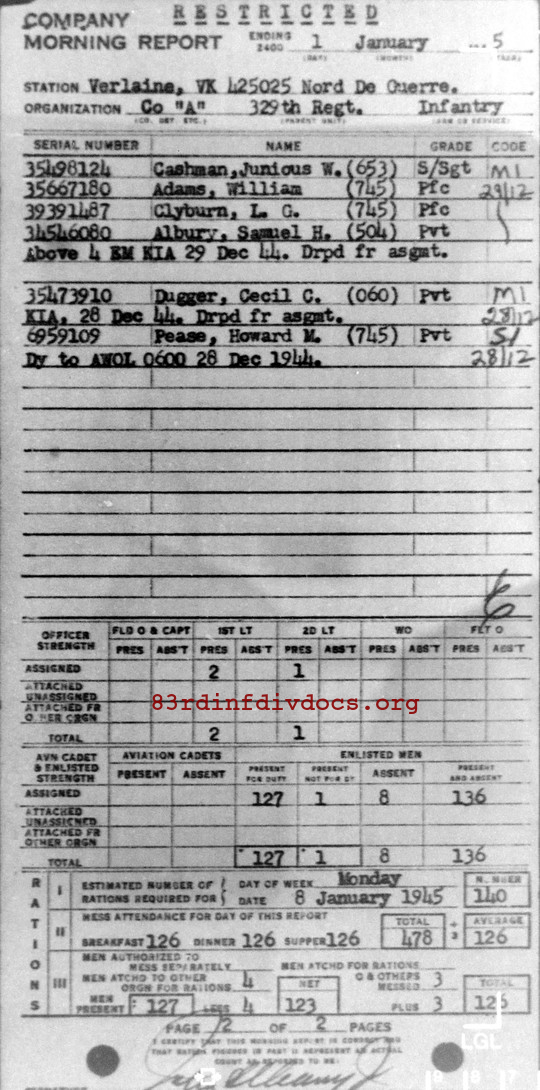 | Unit | A Company, 329th Infantry Regiment, 83rd Infantry Division |