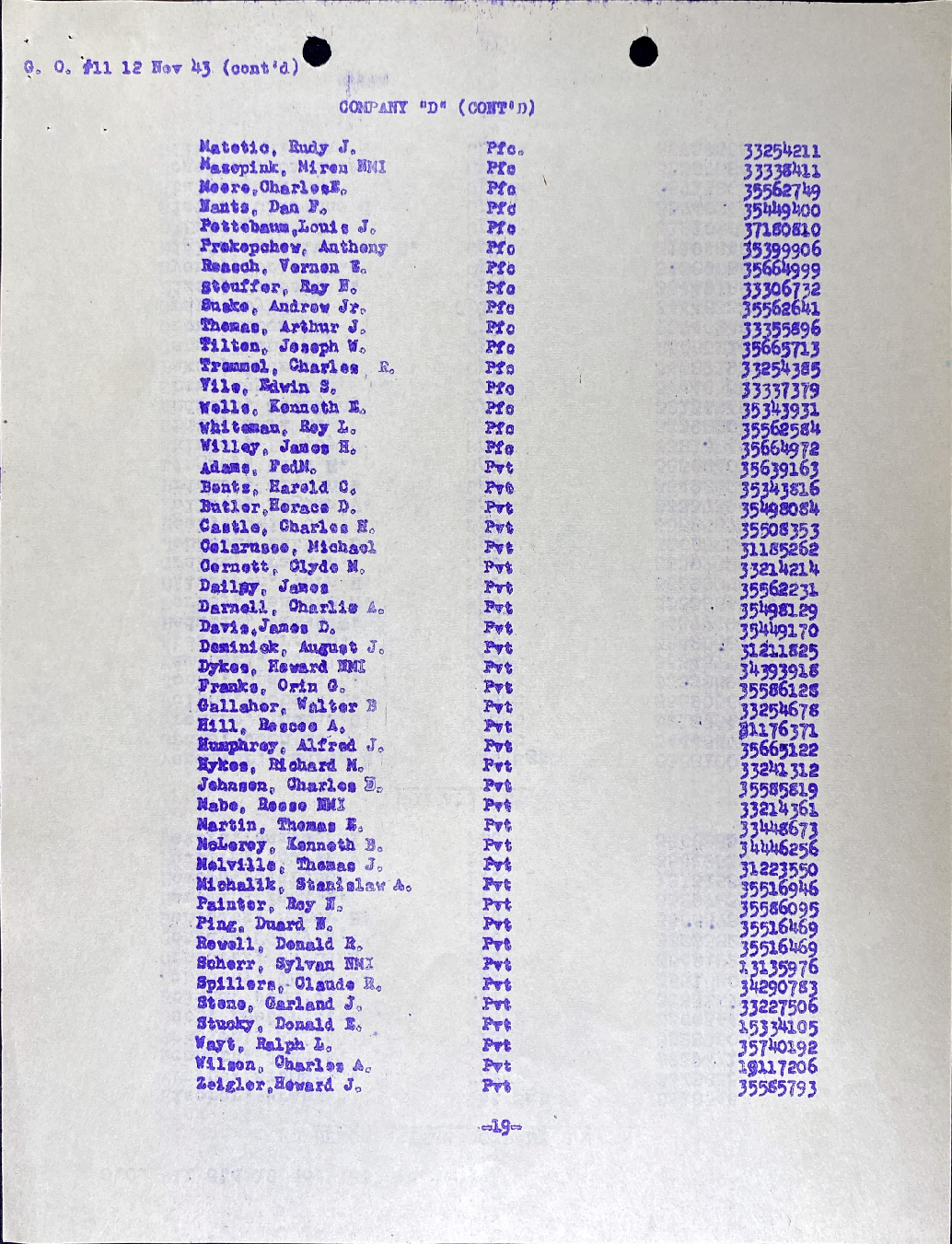 | Private First Class Darnell was a member of D Company. The morning report for August 13, 1944 on page 13 lists him killed in action on August 8, 1944. Page 13 can be seen here as well. |
