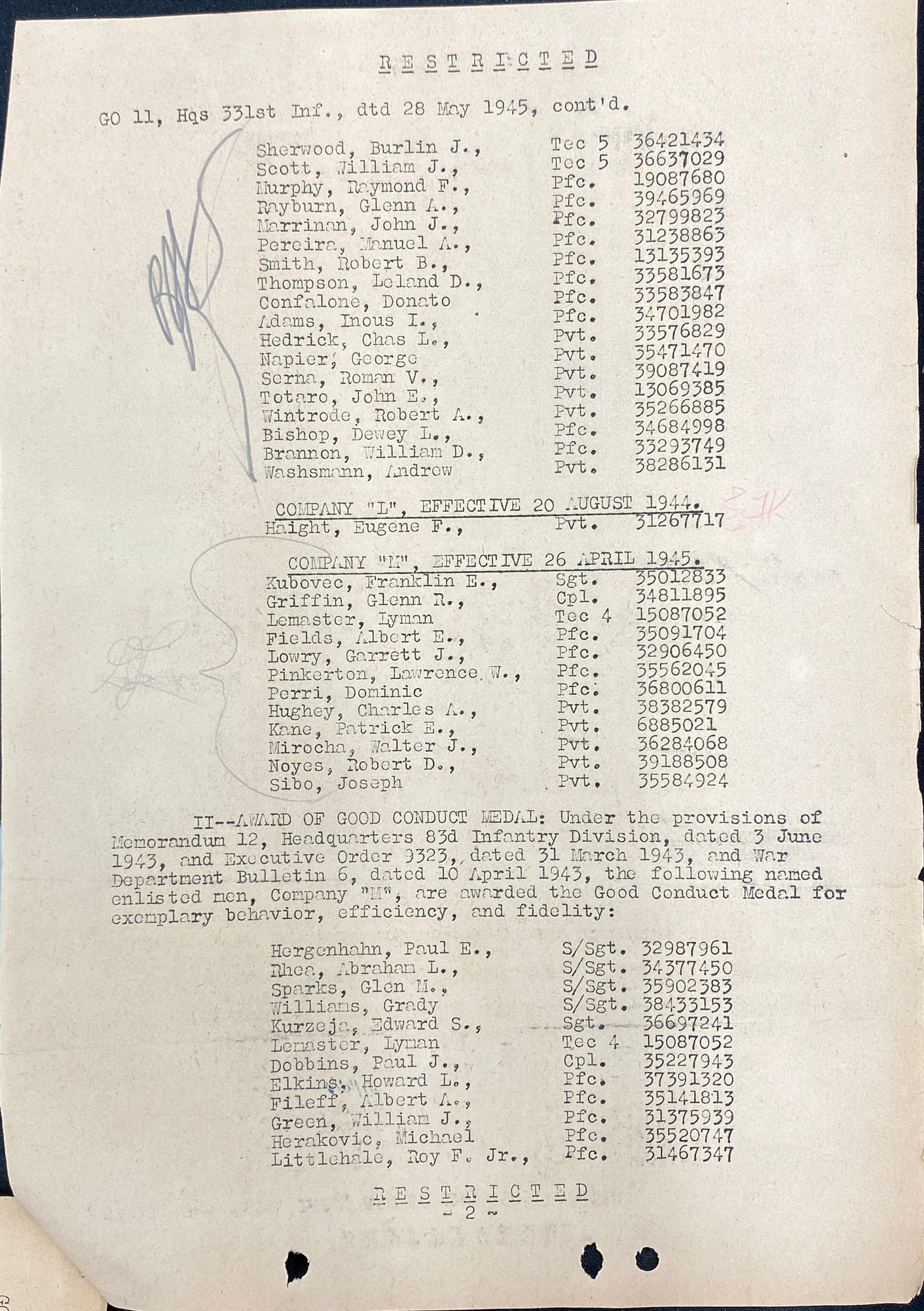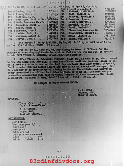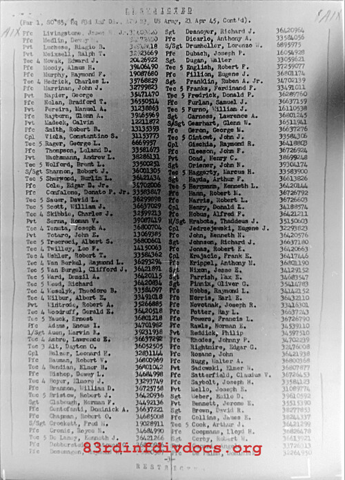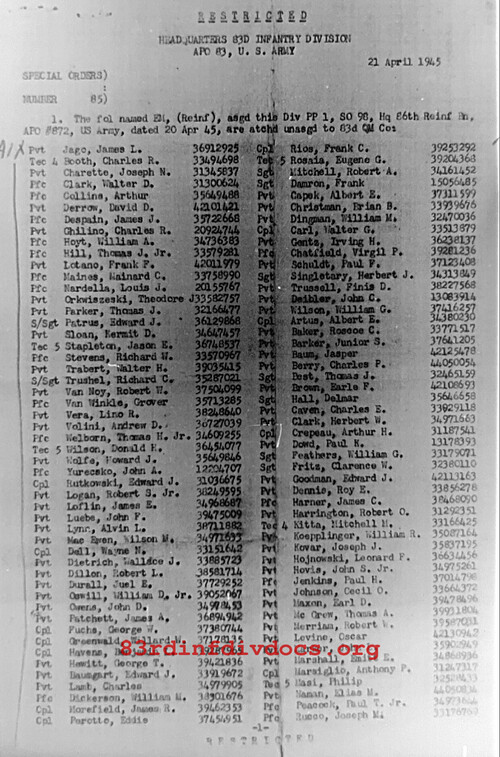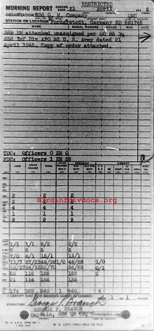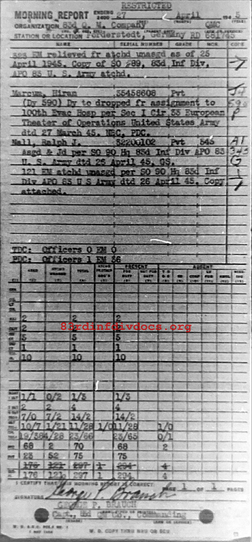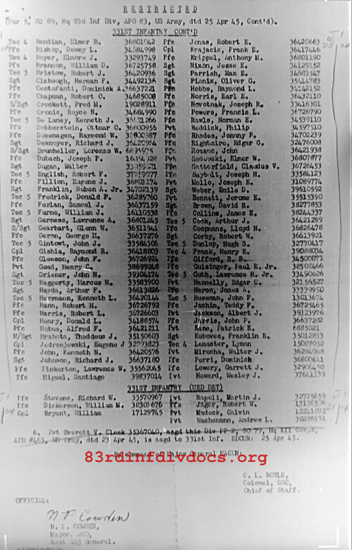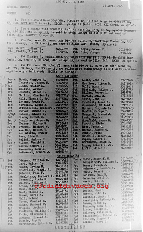| 1945-04-27 | PFC | Released from attachment and assigned to 331st Infantry Regiment on April 25, 1945 | QM / 83 | view page | |