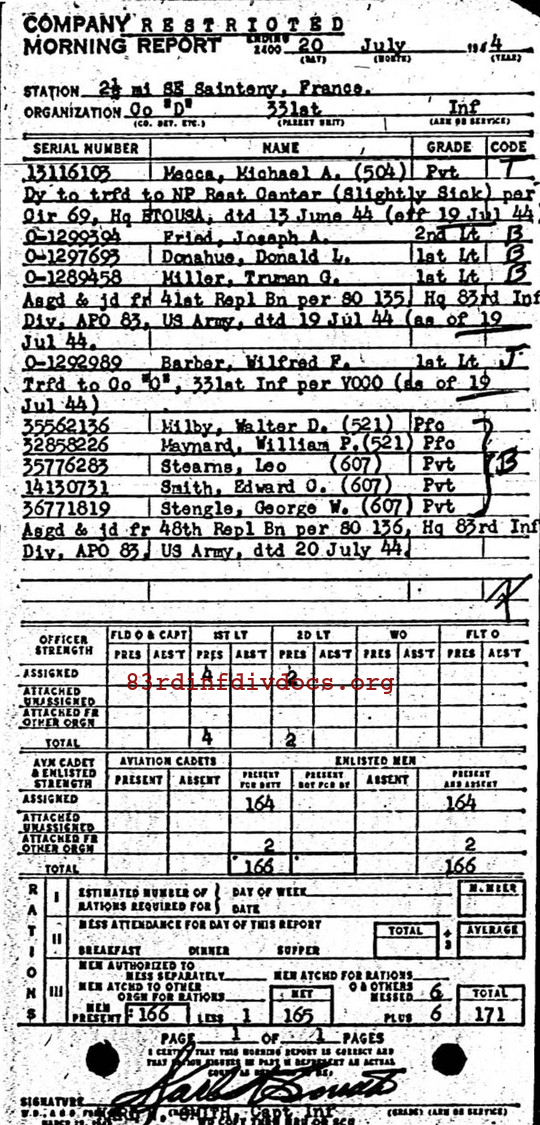 | 1944-07-20 | PFC | Assigned and joined from 48th Replacement Battalion as of July 20, 1944 | 521 | D / 331 | view page |