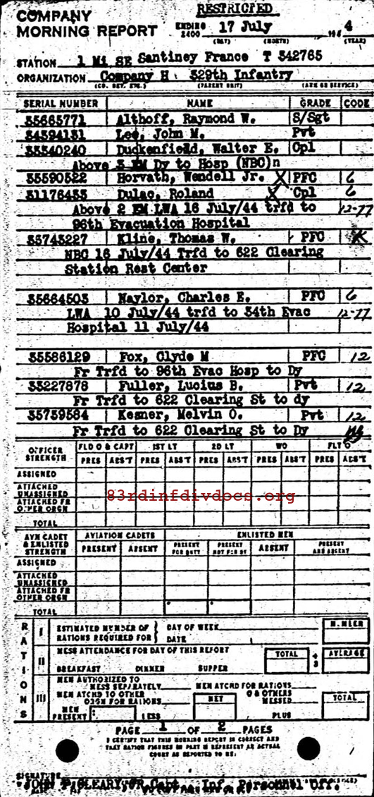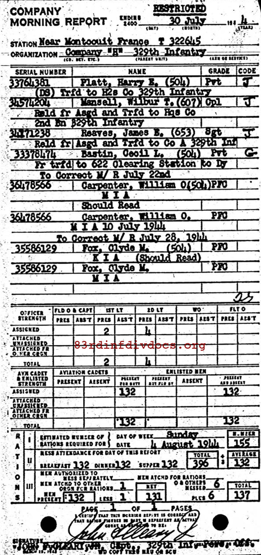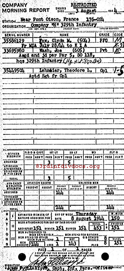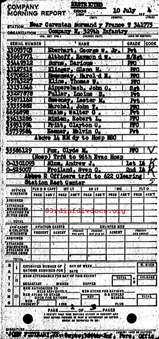 | Private First Class Fox was a member of H Company. The morning report for July 10, 1944 on page 17 lists him transferred to the 96th Evacuation Hospital. Page 43, for July 17, 1944 shows him returning to duty. Page 66, for July 28, 1944 lists him as killed in action. Page 68, for July 30, 1944, corrects this entry as it should read missing in action. The morning report for August 3, 1944 on page 9 lists his status changed from missing in action to killed in action. All relevant pages can be seen below. |